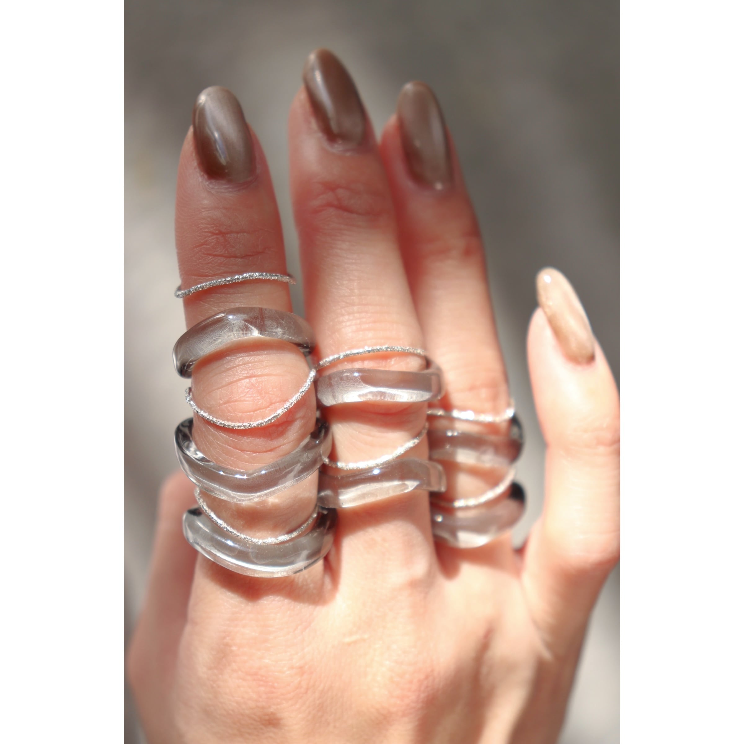 優しい雰囲気の淡いグレーのガラスリングに沿うように作られている、シルバーのリング。