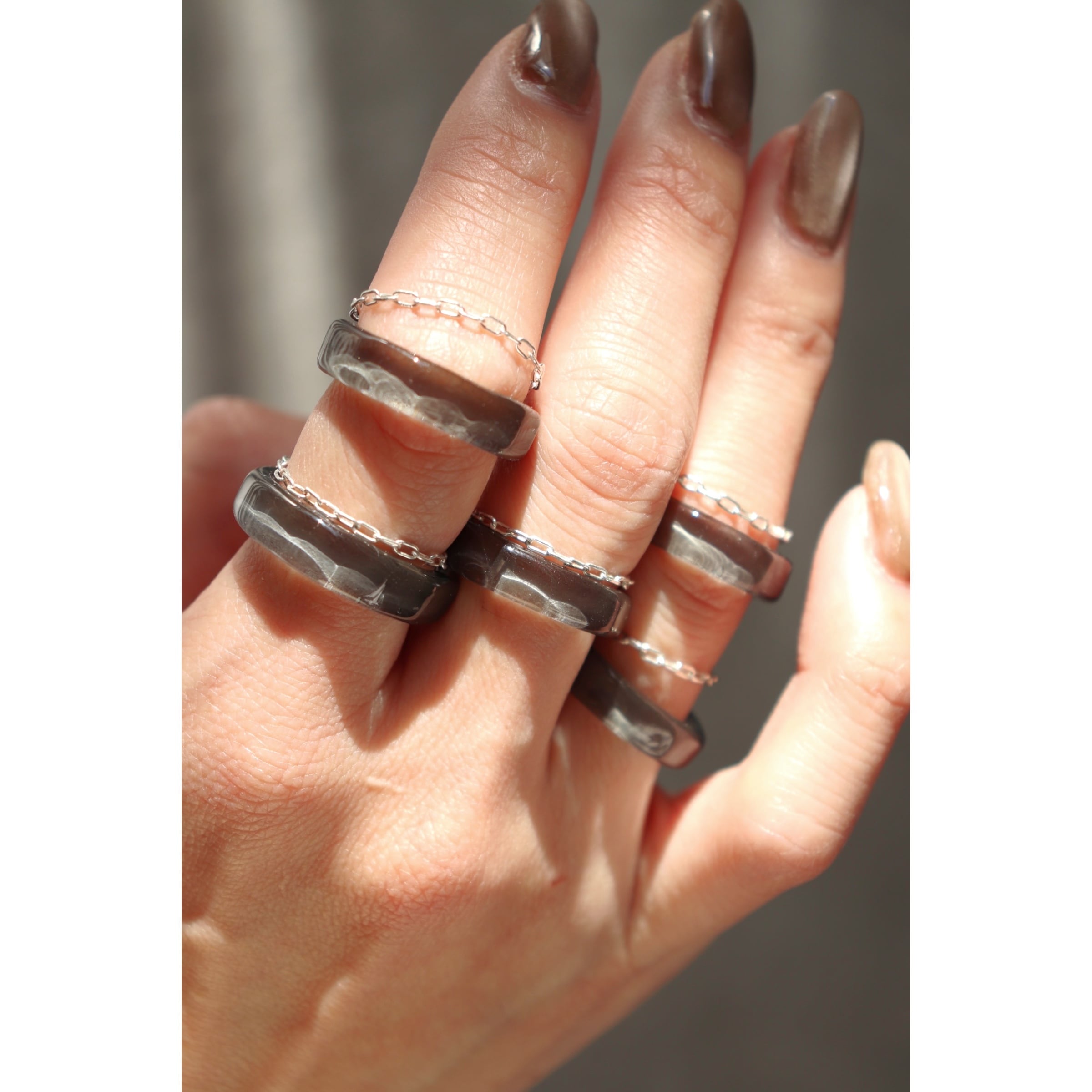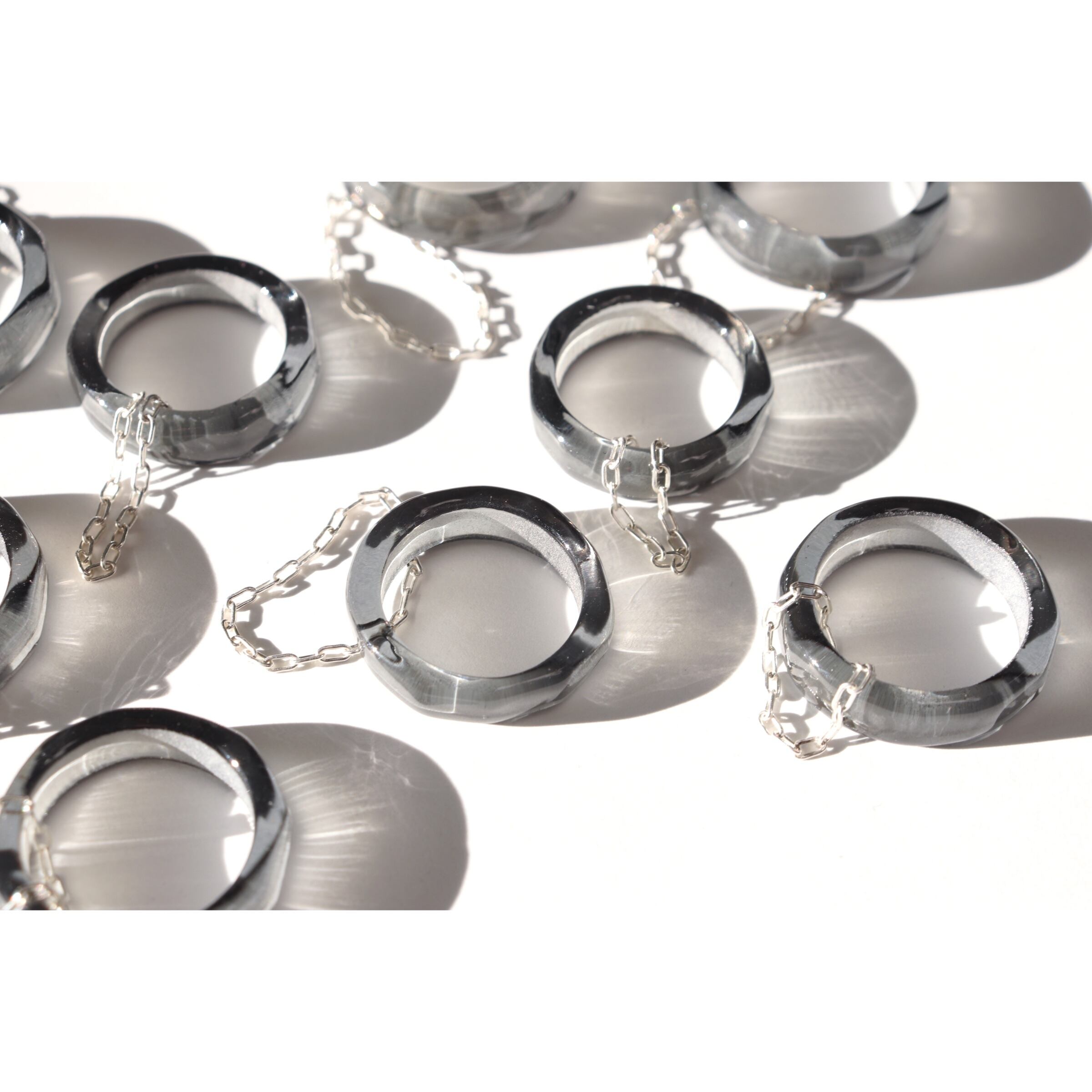 落ち着いたグレーのシンプルなガラスリングに合わせてつくった、シルバーチェーンのリング。